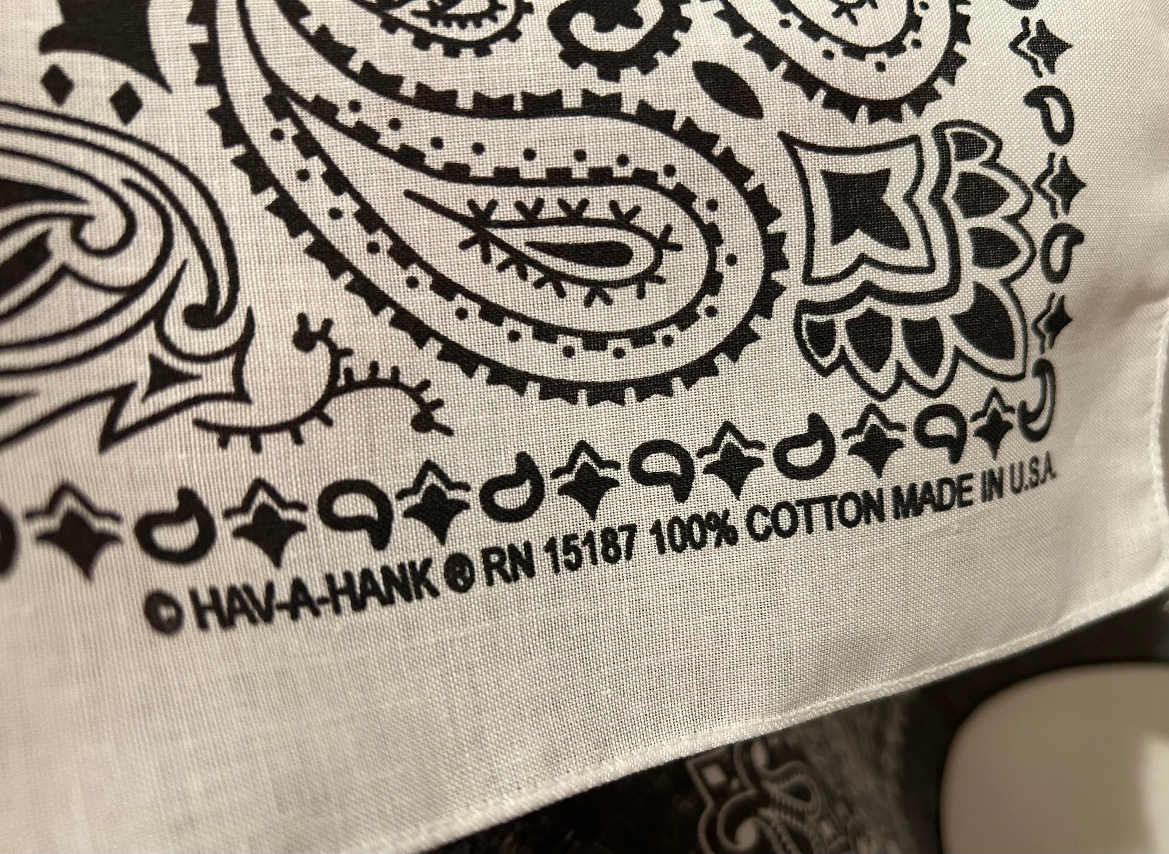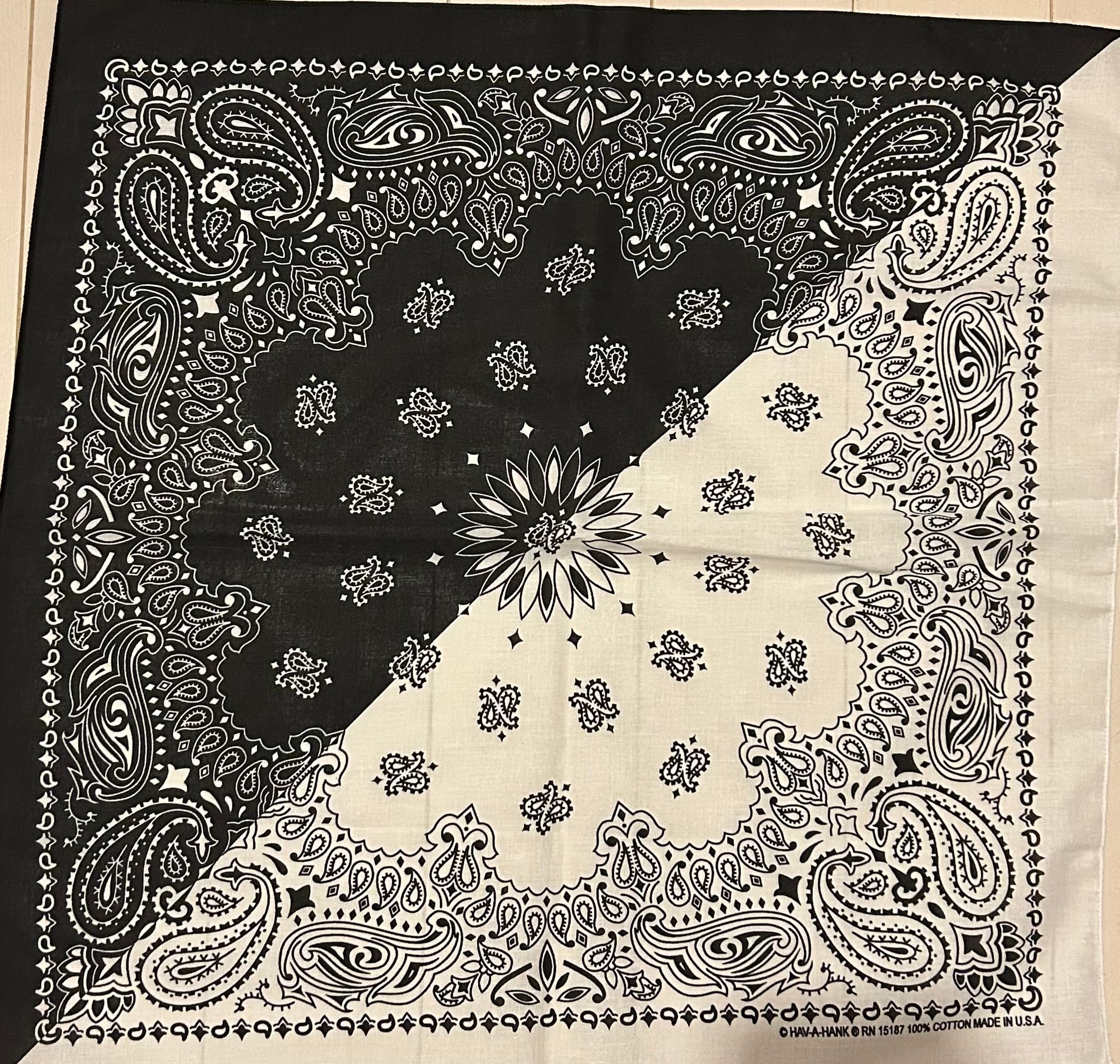 HAV-A-HANKのバイカラーバンダナは、クラシックなデザインが魅力のアイテムです。深いBLKとWHTのコントラストが、個性を引き立ててくれます!さまざまなスタイルに合わせて、オシャレにコーディネートを楽しめます。